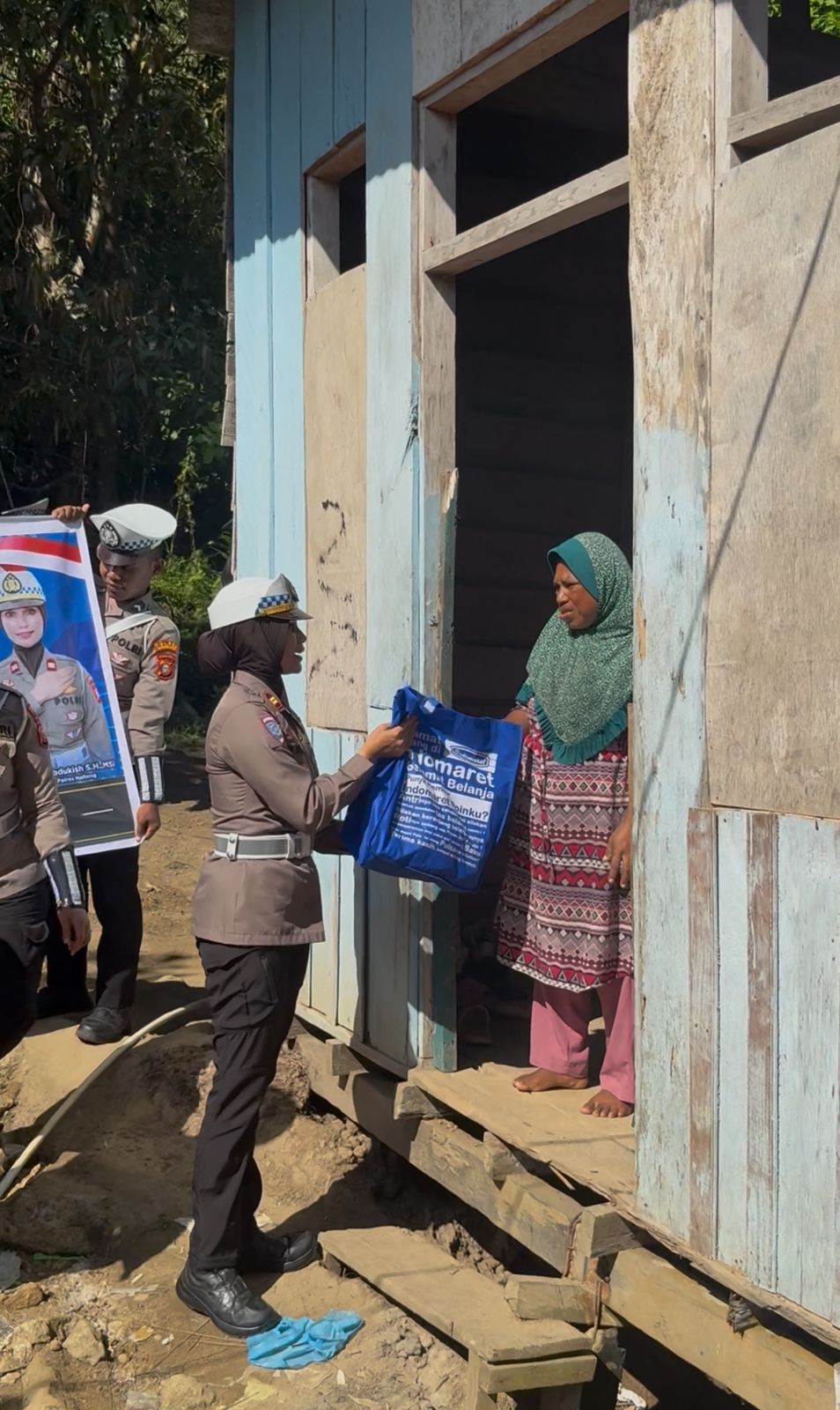 WEDA- Satuan Polisi Lalulintas (Satlantas) Polres Halmahera Tengah melaksanakan kegiatan Polantas menyapa berupa pembagian sembako kepada masyarakat yang membutuhkan dan kurang mampu di Desa Nurweda Kecamatan Weda pada Selasa (4/11)