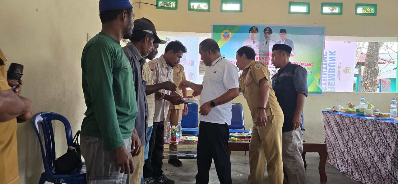 WEDA- Wakil Bupati Halmahera Tengah, Ahlan Djumadil menyerahkan secara langsung 100 Kartu BPJS Ketenagakerjaan untuk pekerja rentan dan insentif sosial, yakni insentif lansia, insentif kepala keluarga tunggal, insentif disabilitas, insentif anak yatim, serta insentif ibu hamil dan ibu menyusui masyarakat Desa Moreala.